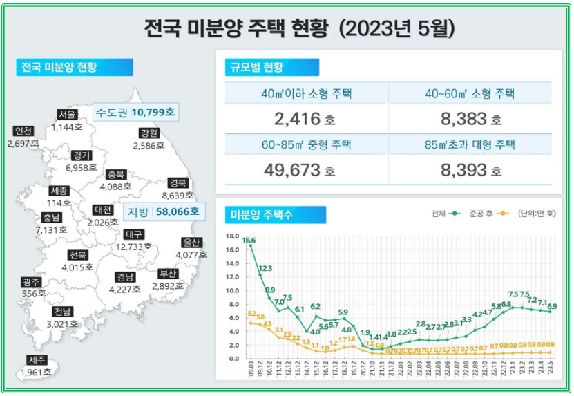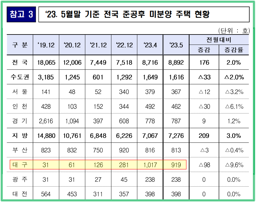 source : 국토교통부 부동산경기가 급속도로 위축되기 시작한 2022년도 하반기부터 현재까지 대구는 그 중에서 가장 심각한 미분양주택현황 및 준공후 미분양 상황이 가장 안좋은 지역이 바로 대구광역시 이기 때문입니다. 준공후 미분양 사태는 기업들이 투자금 회수에 어려움을 겪고 있다는 반증이 됩니다. 이는 부동산기업들이 대출을 받았다면, 유동성 문제에 직면하게 될 수 있는 중요한 요소입니다. 거기에 대구 미분양 주택까지 합쳐진다면 그 규모가 클 수 밖에 없습니다.
