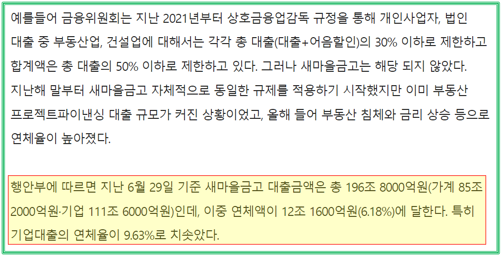source : https://www.donga.com/news/Economy/article/all/20230707/120119428/1 한국은 최근 새마을금고 관련 이슈가 굵직한 내용을 쏟아내고 있습니다. 조금만 검색해보면 많은 뉴스들이 생산된 상태입니다. 수신잔액이 2달 사이에 7조원이 감소. 현재 뱅크런 사태로 미국 실리콘밸리은행 파산 사건이 기사에 함께 거론될 만큼 문제가 가볍지 않다는 점입니다. 여기에 연체율 증가 이슈가 2021년/2022년/2023년도 연체율이 급등하고 있음을 알 수 있습니다.