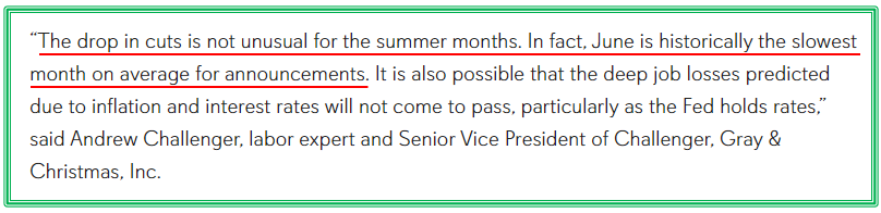 www.challengergray.com 해고자 리포트에 작성되 내용 중 일부 문단 내용입니다. ''(해고자)감축률이 감소하는 것은 여름철 드문 현상이 아님. 6월은 역사적으로 발표(해고자감축률)이 가장 완화되는 달입니다. 특히 연준이 기준금리를 동결함에 따라 인플레이션과 금리로 인해 예상되는 심각한 일자리 감소가 실현되지 않았을 가능성이 있다.'' 앤드류 챌린져가 작성하였습니다.