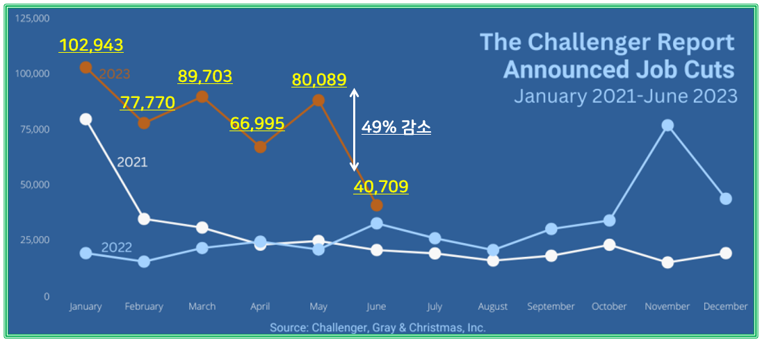 미국경제지표) 챌린져그레이 6월 해고자보고서 49% 감소(f.비농업고용지수)세계 주요 경제지표 분석 2023. 7. 12. 14:11반응형