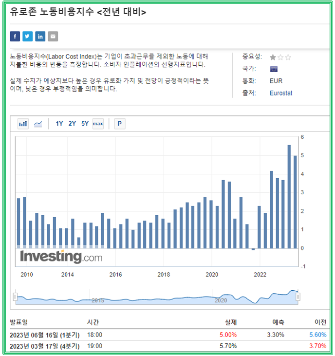 source : kr.investing.com 이는 물가상승을 부추기는 역할을 하면서 부동산 가격 상승과 함께 임금상승을 가져오게 되었습니다. 유로존 노동비용지수가 코로나19 팬데믹 지수 고점을 넘기면서 높은 비용지수 흐름이 계속되고 있고, 함께 흐름을 보였던 에너지 원자재 가격상승과 서비스/식품 등 모두가 상승합니다. 결과적으로 폭발적인 인플레이션을 불러일으키며, 미국과 비슷한 강력한 물가상승으로 이어졌습니다.