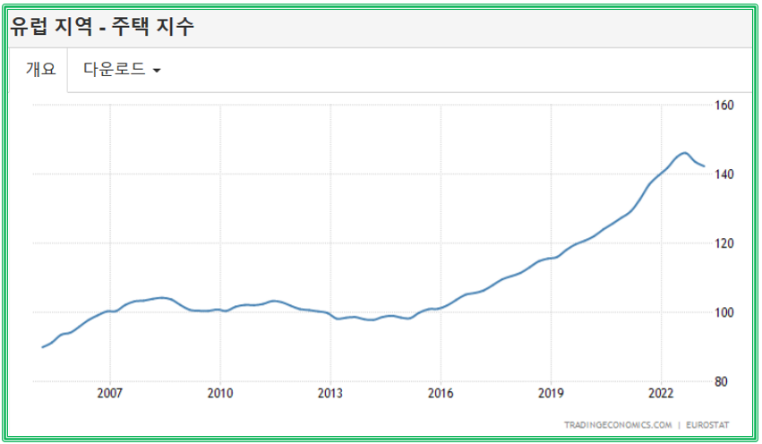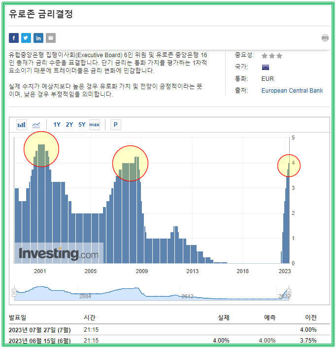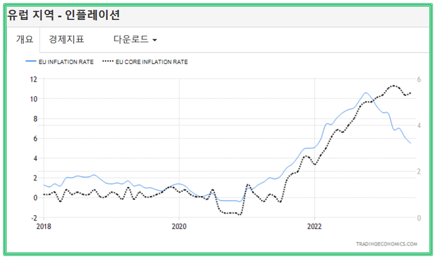 source : ko.tradingeconomics.com 단순 비교이기에 높다라는 의미가 무의미할 수 있습니다. 하지만 데이터 상으로 보이는 고점에서 흐름을 보면 아직 유럽은 하락세가 뚜렷하게 나타나고 있지 않다는게 핵심이 되는 내용입니다. 이번 유로존 ECB 역시 기준금리 인상안을 선택하지 않을까 싶습니다.