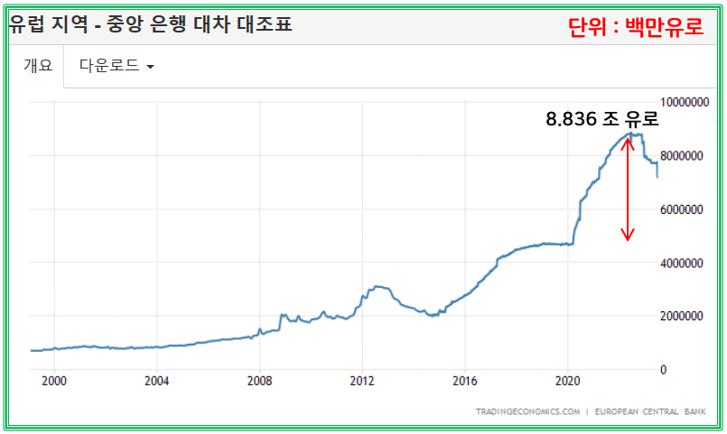 source : ko.tradingeconomics.com 미국보다 비율상으로 조금 적게 확대된 대차대조표. 엄청난 양의 통화가 시중에 공급. 통화량 증가로 이어지며, 화폐가치 하락을 가져왔고, 반대로 자산가치가 상승하게 되는 현상이 나타나게 됩니다.