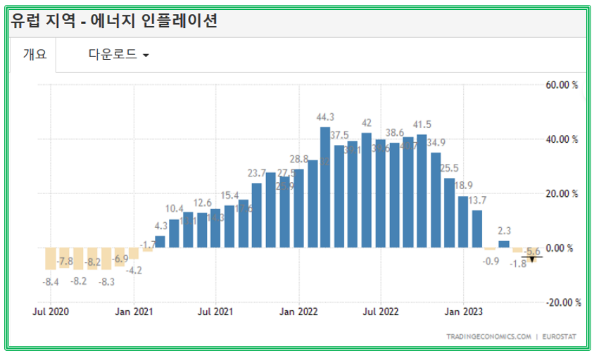 source : ko.tradingeconomics.com 유럽은 러시아로부터 높은 천연가스 에너지 원자재 의존도를 보였습니다. 하지만 대형 악재가 터지면서 러시아는 판매량을 줄이게 되었고, 그로인한 천연가스와 원유 가격이 급등하면서 전세계적으로 에너지 원자재 가격 상승으로 생산자물가지수 PPI가 상승하면서 소비자물가지수로 영향이 이어지면서 CPI가 상승하였습니다.