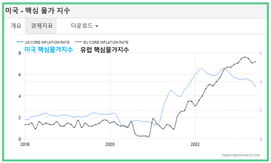 source : ko.tradingeconomics.com 유럽 소비자물자지수 CPI(6월 5.5% 잠정치)와 근원소비자물가지수 CORE CPI(6월 5.4%) 입니다. 19일 저녁 6시에 6월 (근원)소비자물가지수 확정치가 발표가 됩니다. 글이 시장예상치와 다를 수도 있겠지만, 헤드라인 인플레이션은 10.6%가 나왔던 2022년 10월 수치 이후로 빠르게 상승속도보다 조금 더 빠른 하락추세를 보이고 있습니다.