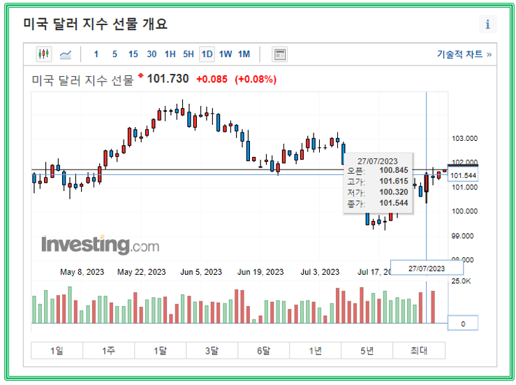 source : kr.investing.com 지난 7월 27일 기준금리인상을 단행했던 미국 FOMC 인상함에도 일봉차트에서 상승세가 둔화하는 현상을 보이고 있고 현재 작성하고 있느 기준 101.74를 가리키고 있습니다. 필자가 판단하기에 현재 달러지수가 추세를 깨고 올라갈 분위기보다 국제정세 분위기는 달러인덱스 상승세를 막으려는 모습입니다.