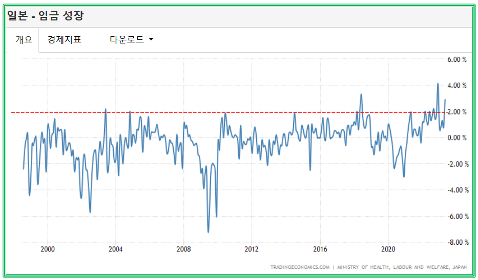 source : ko.tradingeconomics.com 1980년초 이후 가장 높은 핵심 물가지수를 보이고 있는 일본 물가상황. 과거 경제위기와 중국 위안화쇼크 및 중국 리스크때 나타났던 물가지수를 뛰어 넘으며 4%를 넘는 상황이다. 일본 임금상승률 또한 2% 이내에서 유지가 되엇지만, 이번 코로나 기간 상단을 깨버리며 4%를 터치했고, 최근 지표 역시 2%위에서 흐름을 보이고 있는 것으로 확인됩니다.