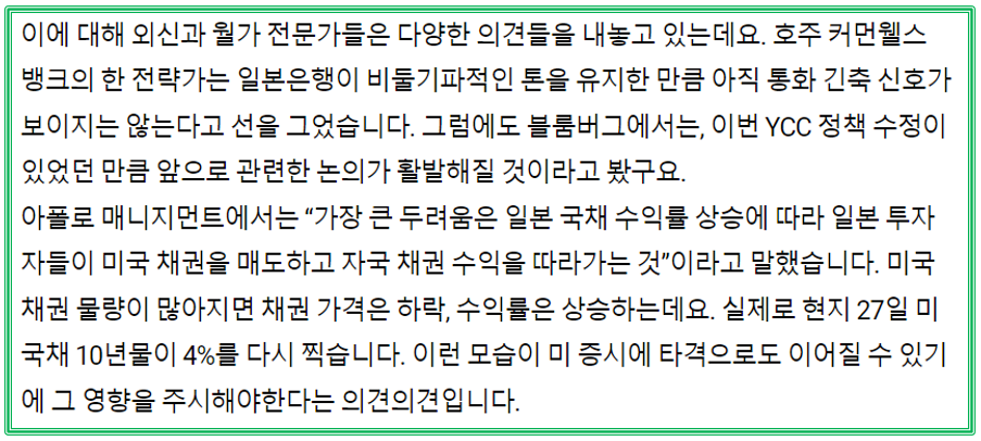 일본은행 BOJ에서 수익률곡선제어 YCC 정책 변화를 28일 금융통화정책회의에세 발표하였습니다. 그래서 일본 채권시장과 외환시장 일본증시 등 전방위적으로 영향이 나타나면서, 그에 따른 우려의 목소리가 더해지고 있습니다. 이런 일본 시장의 변화 끝에는 미국 역시 자유로울 수 없는 환경에 노출이 되는 상황이 되었습니다.