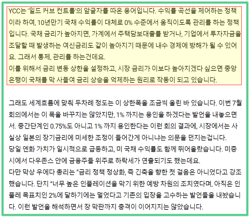 SOURCE : https://www.wowtv.co.kr/NewsCenter/News/Read?articleId=A202307310022&t=NNv 일본은행 BOJ는 수익률제어곡선 YCC를 통해 10년물 국채금리를 0.5%로 묶어두었습니다. 이번 결정은 최대 1%까지 추가로 국채를 매입하지 않겠다는 발표를 7월 28일 발표하였습니다. 가끔씩 일본이 언제 통화정책을 변화를 주느냐 이슈가 한 번씩 등장했는데, 지난 0.5% 확대 이후 또 다시 1%로 확대하는 정책이 시행되었다는 점에서, 일본 통화정책이 추가로 변화(긴축정책으로) 가능성 역시 배제할 수 없는 상황이다.