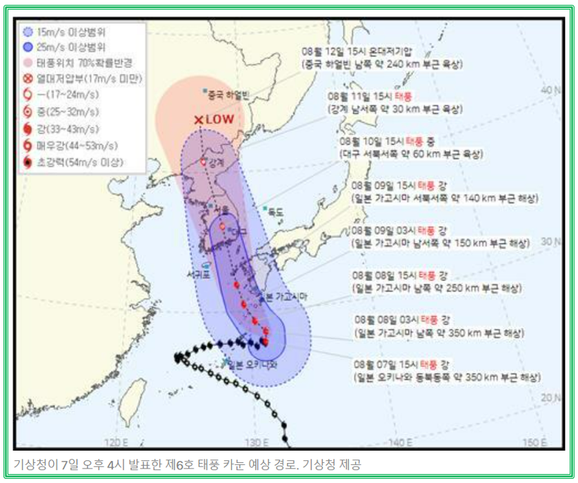 6호 태풍 카눈이 한반도 예상경로입니다. 7일 오후 4시에 발표한 예쌍경로로 한반도를 관통할 것으로 경로가 예상됨에 따라 농작물 & 저지대 침수 / 농작물 피해 / 강한 바람에 의한 과수 피해까지 태풍이 가져올 수 있는 다양한 피해가 예상되고 있습니다. 바람에 의한 피해가 크기 때문에 참 어렵습니다 ㅠㅠ 많은 비도 힘든데 말이죠.