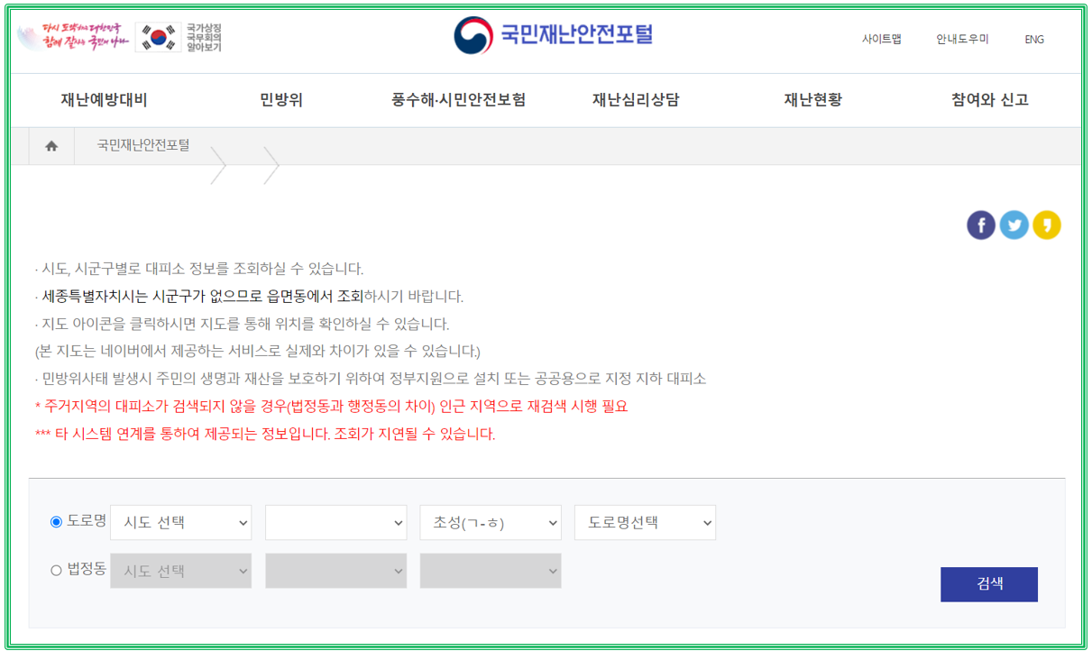 그래서 앞서 작성했던 포스팅에서 국민재난안전포털 아래 링크복사 후 들어가셔서, 거주하고 있는 지역을 검색하시면 대피소 관련 내용들을 확인하실 수 있습니다. 갑작스런 상황에 대비하기 위해 시군별로 조회가 가능합니다. 기본 상식이라고 생각하시고, 내 가족의 안전을 위해서라도 확인해보는건 괜찮지 않을까요^^