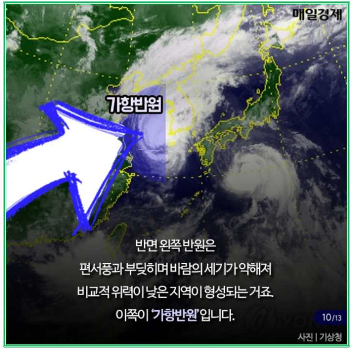source : https://post.naver.com/viewer/postView.naver?volumeNo=34423074&memberNo=37570062&vType=VERTICAL 반시계 방향으로 회전하는 태풍 반경 오른쪽이 피해가 더 큰 이유에 대한 설명입니다. 편서풍의 영향으로 가속을 받는 오른쪽 반경과 상대적으로 편서풍과 마주하는 왼편은 상쇄되며 바람의 강도도 약해지게 됩니다. 강원영동/경상도 지역에 더 많은 비가 내릴 것으로 예상되고, 바람의 강도 역시 전라도/수도권과 비교시 태풍의 반경 오른쪽이 더 피해가 우려되는 점입니다.