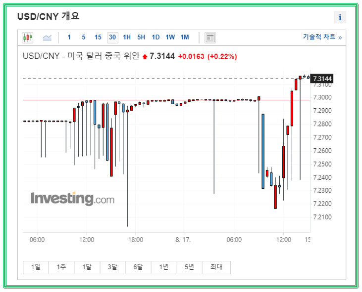 source : kr.investing.com 작성 중 발표된 기사를 보니 역레포를 통해 단기유동성 자금이 1630억 위안이 투입되었다는 뉴스가 나왔습니다. 역레포로 시장에 유동성을 공급했기 때문에 위안화 환율 방어에 더 어려운 상황을 가져올 수 있습니다. 15분봉(오른쪽) 차트를 보면 변동폭이 엄청나게 나타나고 있습니다. 전 고점을 넘기게 되면 중국 정부는 위안화 절상조치가 있었습니다. 상황이 좋지 않다는거죠.