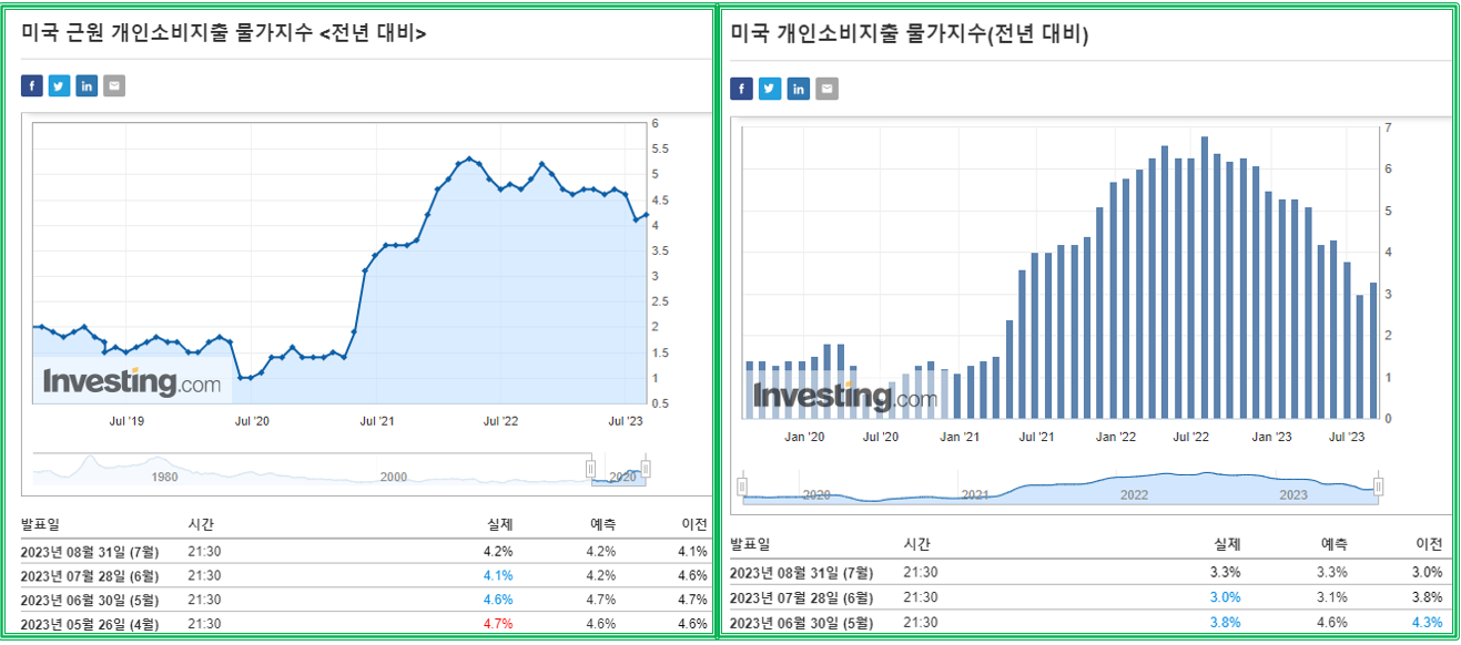 source : kr.investing.com 8월 역시 드라이빙시즌 아래에 있는 기간입니다. WTI원유차트에서 노란색 박스 7월보다 8월이 평균적으로 더 높은 가격 흐름을 보이고 있기 때문에 8월에도 상승이 나오지 않을까 추론해 봅니다. 먼저 발표되는 8월 근원소비자물가지수 경제지표가 7월 대비 어떤 흐름을 보였는지에 결과치를 본다면 8월 PCE 의 방향성을 예상하는데 도움이 될 듯 합니다. 일단 상승 가능성이 더 높아 보입니다.