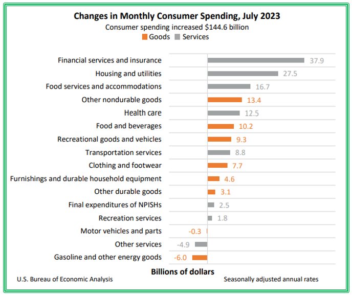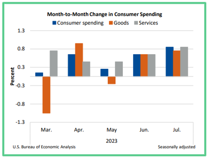 보고서에 따르면, 7월 실질 PCE의 0.6%증가는 상품지출 0.9% / 서비스지출 0.4% 증가한 것을 반영하였습니다. 비내구재인 게임/장난감/취미 등이 주도했고, 레크레이션재 및 차량 항목에서 비디오 오디오 사진정보처장비 등이 주도하였습니다. 서비스 지표항목에서는 음식서비스 , 숙박(푸드서비스 주도) 금융서비스 및 보험(포트톨리오 관리 및 투자자문 서비스가 주도) , 주택 및 유틸리티가 증가한 것으로 작성되었습니다.