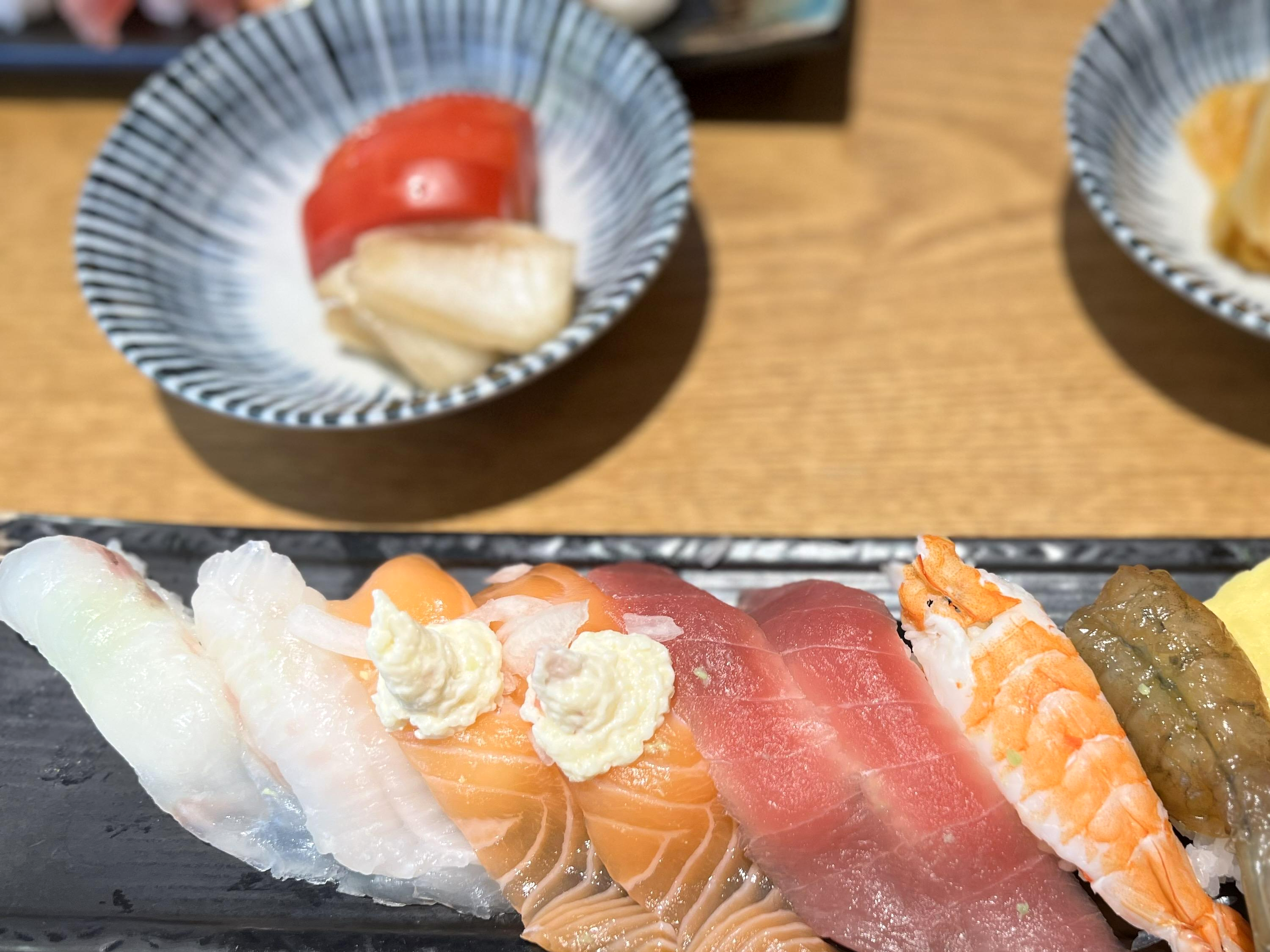 점심특선은 요로코롬 초밥이 나오기 전에 미니 계란찜과 냉모밀소바 새우&고구마 튀김 등등이 제공됩니다. 락교와 단무지는 주문하는 장비 아래에 있어 드실만큼 덜어서 작은 용기에 담으시면 됩니다. 개인적으로 단무지보다 락교가 더 맛있네요. 미니 계란찜부터 작은 스푼으로 쏘옥 먹고, 다음으로 냉모밀소바를 냠냠하는 중에 초밥이 세팅되었답니다 ~~